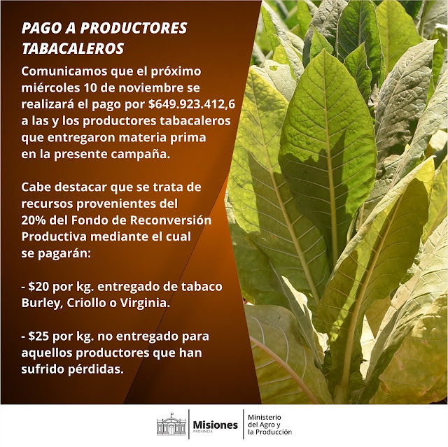 Finalmente, desde el Ministerio del Agro y la Producción explicaron que se pagará $20 por kg. entregado de tabaco Burley, Criollo o Virginia. En tanto, se abonará $25 por kg. no entregado para aquellos productores que han sufrido pérdidas.