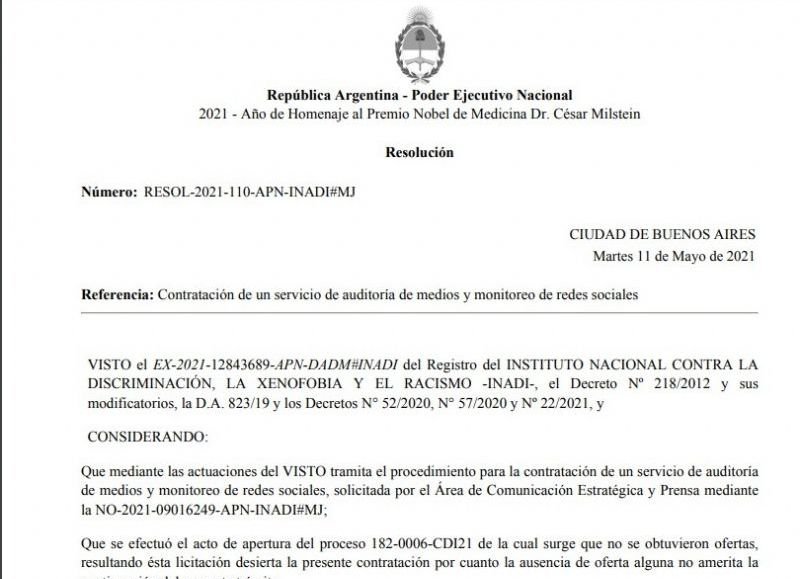 Los seguimientos se realizan en función de una serie “de palabras claves y secciones específicas brindadas por el Inadi”. En una de las cláusulas se aclara que “esas palabras pueden variar e ir agregándole en el día a día, en función de los requerimientos específicos del área de Comunicación del instituto”.