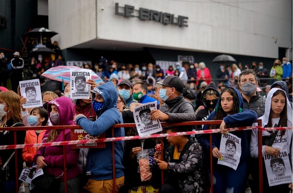 Le Brique, que no abrió esta temporada –«por lo de Fernando», se oye en una conversación callejera–, está empapelada de carteles que piden justicia, con la cara de la víctima, incluyendo la puerta por la que los patovicas la sacaron. Detrás del escenario cuelgan banderas con fotos. Algunas personas sostienen cartulinas con el mismo reclamo. Muchos, el cartel que también se ve en algunos negocios. Por momentos llueve. Hay quienes se refugian debajo de sus paraguas, los techos de la discoteca o de los comercios cercanos. La avenida 3, entre el paseo 102 y Buenos Aires, está cortada al tránsito. También la siguiente cuadra. Hay policías bonaerenses y  una ambulancia. Los presentes gritan «perpetua», «asesinos», «justicia», «fuerza».