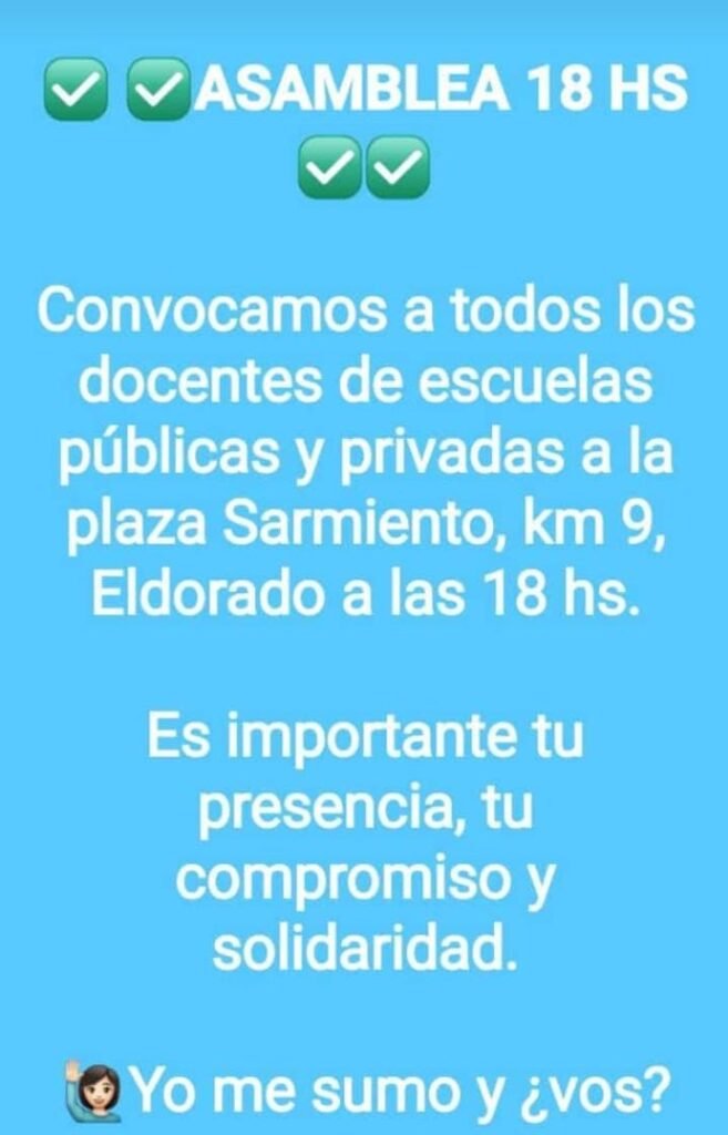 Docentes auto convocados tendrán asamblea hoy 18 hs en la plaza Sarmiento del km. 9 de Eldorado frente a la Municipalidad, dado a la falta de atención del gobierno Provincial en solucionar, para ver como se podría salir de esa situación tan confusa de que los gremios allegados al gobierno Provincial siempre aceptan menos porcentajes inclusive menos de lo que se trato en otras Provincia .