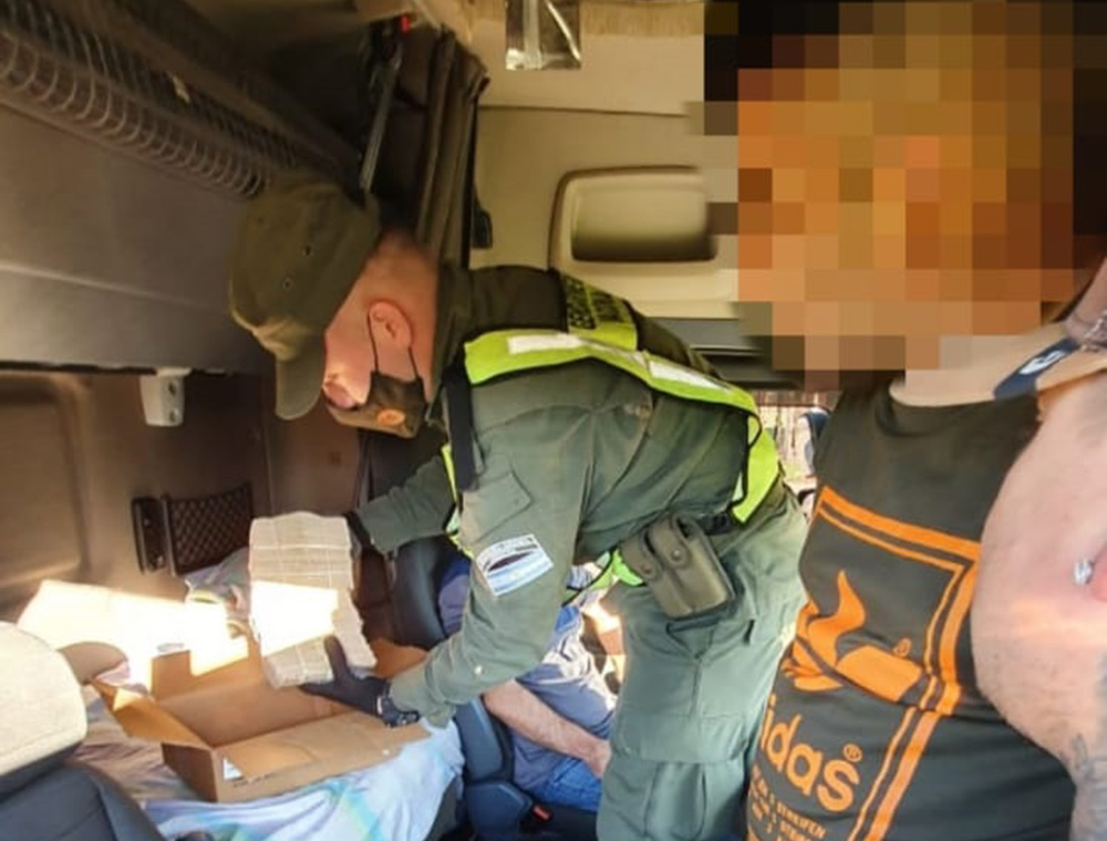 Al momento de inspeccionar la cabina del conductor, los efectivos detectaron una sospechosa caja de cartón, que se encontraba escondida en la parte superior de la cama. Al inspeccionar el contenido de la misma, los gendarmes hallaron un total de 100.000 Reales, sin documentación que avale su legal tenencia o transporte.