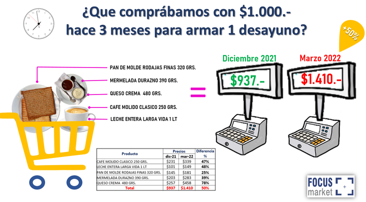 «En diciembre de 2021, comprábamos para el desayuno: pan de molde 320 grs, mermelada de durazno 390grs, queso crema 480grs, café molido 50grs y 1 litro de leche con menos de $1000 ($937), sin embargo 3 meses después necesitamos para cubrir este desayuno $ 1.410, un 50% más», destaca el informe.