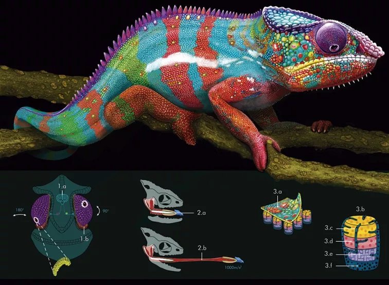 Sobre su dibujo del camaleón multicolor sostuvo que quiso resaltar tres cuestiones que considera excepcionales: “Por un lado su visión, estar dentro de su cerebro sería como mirar dos películas diferentes al mismo tiempo en calidad HD ya que cada ojo puede moverse independientemente del otro, sumando una amplitud visual de alrededor de 350°. En segundo lugar, su lengua, ya que una vez detectan a su presa, el hueso interno junto con el músculo acelerador disparan la lengua con una aceleración brutal. Y por último, su epidermis, dada la complejidad de arreglos celulares que utilizan para cambiar de colores. Todo esto en su conjunto me pareció un desafío interesante para poder plasmar en una ilustración”.