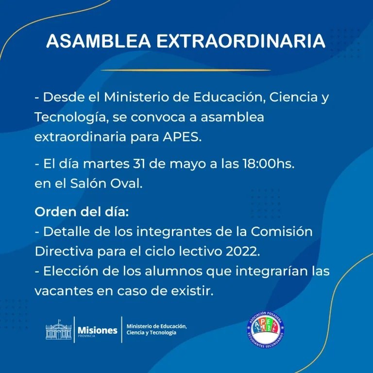 El Ministerio de Educación, Ciencia y Tecnología, a través de la Resolución N° 077 del 06 de mayo de 2022, convoca a Asamblea Extraordinaria de Apes, la Asociación Posadeña de Estudiantes Secundarios, para el 31 de mayo a las 18 en el Salón Oval del Ministerio, planta baja.