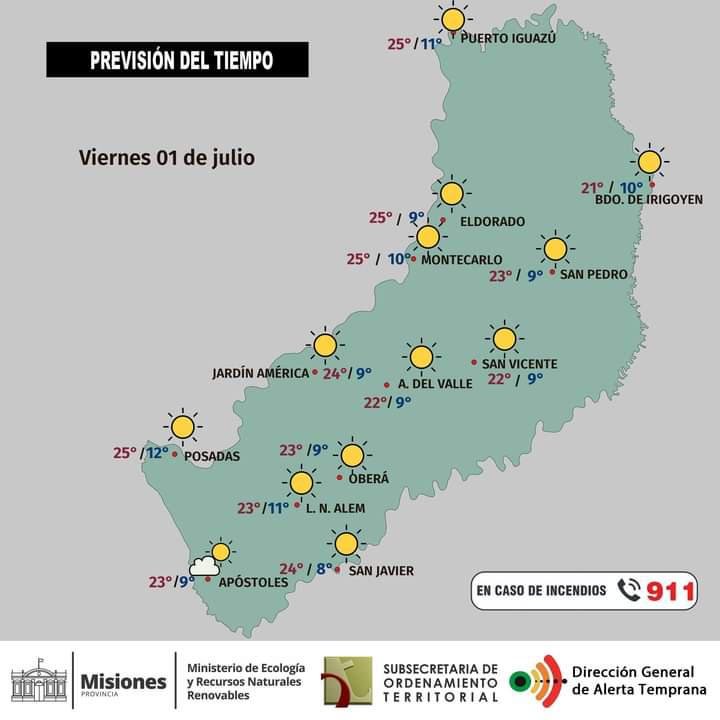 Temperaturas: máxima en la provincia estimada en 27 °C para Posadas con 28 °C de sensación térmica, la mínima sería de 13 °C en Eldorado.