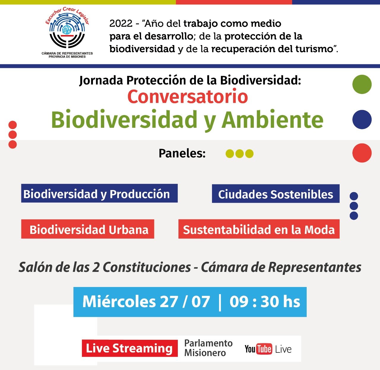 ORGANIZADO POR LA CAMARA DE REPRESENTANTES DE LA PROVINCIA DE MISIONES ESTE MIERCOLES 27 de JULIO A LAS 9:30 HORAS EN EL SALON DE LAS 2 CONSTITUCIONES DE LA MISMA CAMARA SE REALIZARA UN CONVERSATORIO-JORNADA DE PROTECCION DE LA BIODIVERSIDAD Y AMBIENTE CON PANELES DE BIODIVERSIDAD Y PROTECCION, CIUDADES SOSTENIBLES, BIODIVERSIDAD URBANA Y SUSTENTABILIDAD DE LA MODA.