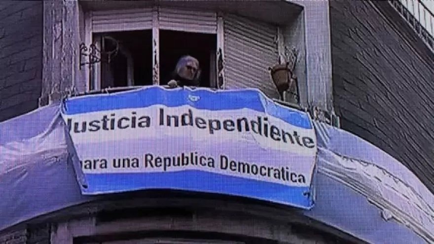 En efecto, Ximena de Tezanos Pinto, una pintoresca señora de pelos azules que se hizo conocida por dejarle banderas con “Estamos hartos” dedicadas a CFK en el balcón de su casa, vive en el piso superior a la vicepresidente.