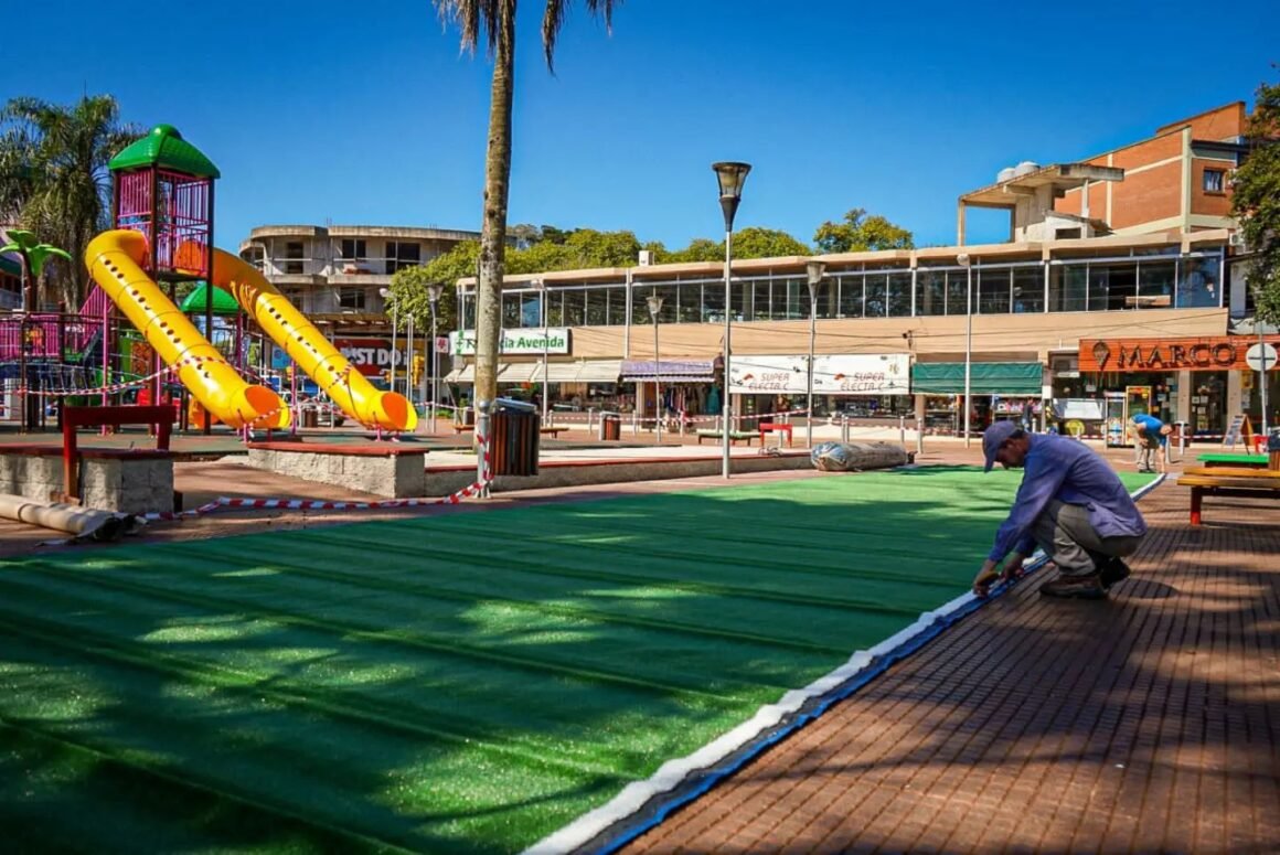 El equipo de trabajo inició la colocación de la alfombra de césped sintético, que daría las terminaciones necesarias al lugar. Con estas tareas finalizadas, los niños contarán un espacio de juegos completo, moderno y seguro.