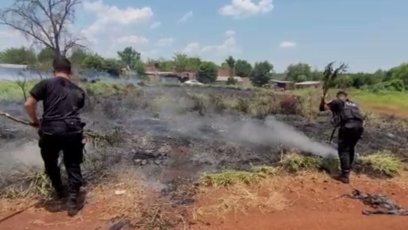 Un video de efectivos policiales apagando un incendio de malezas recorre las redes sociales. Ocurrió este miércoles en barrio Centro Correntino de Posadas.