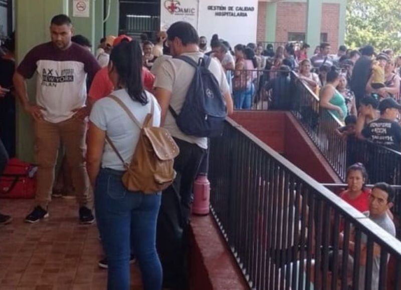Trabajadores que prestan servicio de seguridad en el Hospital Samic de Eldorado realizan una manifestación frente al nosocomio en repudio al despido de dos empleados.