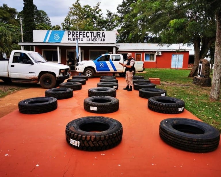 En el marco de la lucha contra el contrabando y el narcotráfico que viene llevando adelante la fuerza en todo el país, personal de la Prefectura Naval Argentina Puerto Libertad, cuya jurisdicción comprende también Puerto Wanda y Puerto Esperanza; secuestró este martes varias cubiertas que pretendían ser ingresadas al país de manera ilegal.