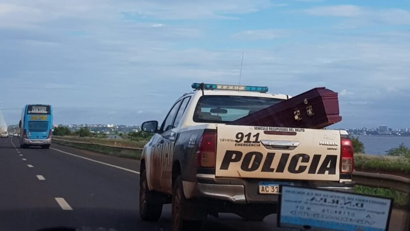 Una bizarra escena fue capturada este miércoles por la mañana en la Colectora Sur de Posadas: un patrullero que sería de la comuna Pueblo Illia –un pueblo que depende administrativamente de la ciudad de Dos de Mayo, en el departamento de Cainguás-, trasladaba un féretro en la parte trasera del vehículo.