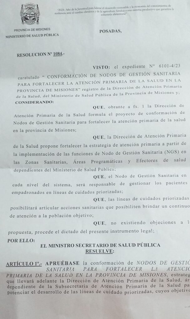 El Ministro de Salud Dr. Oscar Alarcón junto al Diputado Martín Cesino y el equipo de salud , con presencia de todos los directores de distintas áreas del ministerio , más el acompañamiento de muchos directivos responsables de los distintos nosocomios de la provincia realizaron el lanzamiento de la resolución ministerial n°1084 expediente n°6101-4/23 donde se conformo los nodos de gestión sanitarias para fortalecer la atención primaria en toda la provincia .