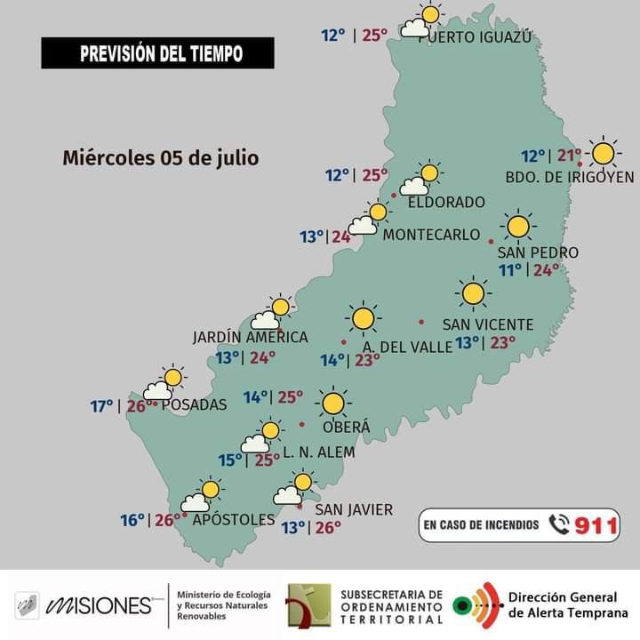 Temperaturas: máxima en la provincia estimada en 25 °C para Eldorado; la mínima sería de 16 °C en Bernardo de Irigoyen.