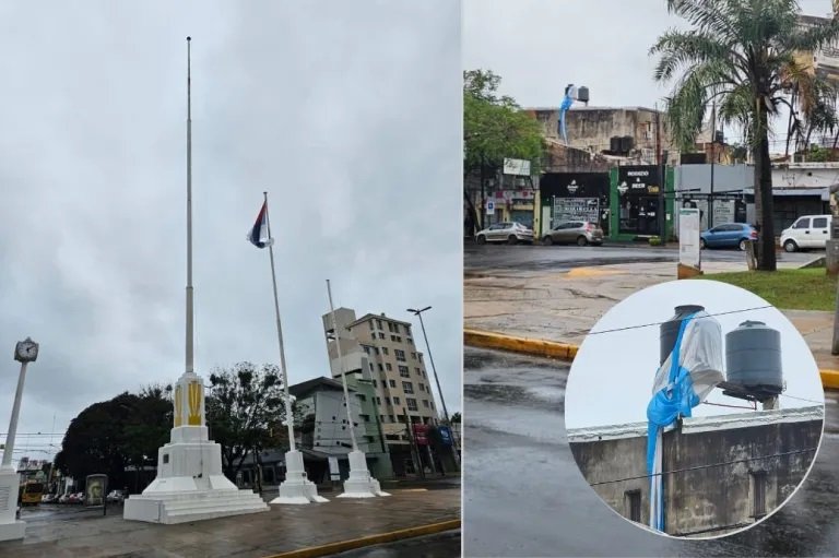 Una de las víctimas de la acción del viento fue la bandera argentina que se encontraba izada en el mástil principal de la plazoleta que se ubica en el cruce de las avenidas Uruguay y Mitre. Allí, por acción del viento, la enseña patria se soltó y voló algo más de 60 metros hasta enredarse en el tanque de agua de un edificio bajo de que tiene frente sobre la calle República del Líbano, junto a una tradicional casa de pastas de Posadas.