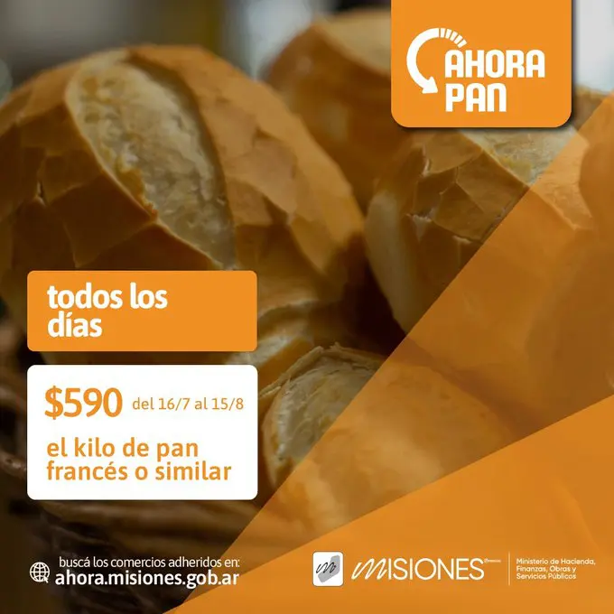 Tras una serie de reuniones con empresarios panaderos de Misiones, se acordó actualizar nuevamente las condiciones del programa Ahora Pan, que desde este domingo 16 de julio hasta el martes 15 de agosto inclusive seguirá vigente con un precio máximo de hasta $590 por kilo de pan francés o similar.