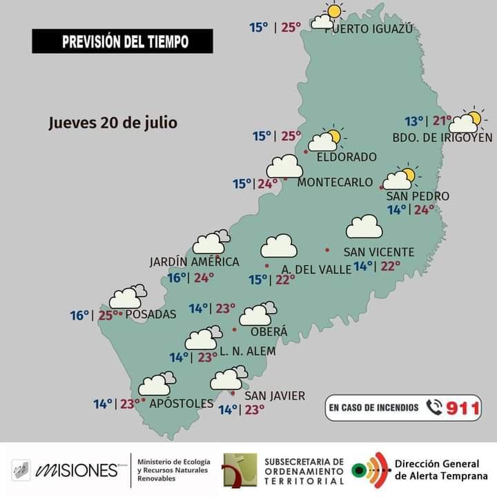 Temperaturas: máxima en la provincia estimada en 25 °C para Puerto Iguazú; la mínima sería de 13 °C en Bernardo de Irigoyen.