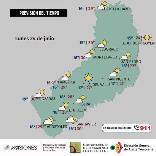 Temperaturas: máxima en la provincia estimada en 26 °C para Eldorado; la mínima sería de 14 °C a la noche en Apóstoles.