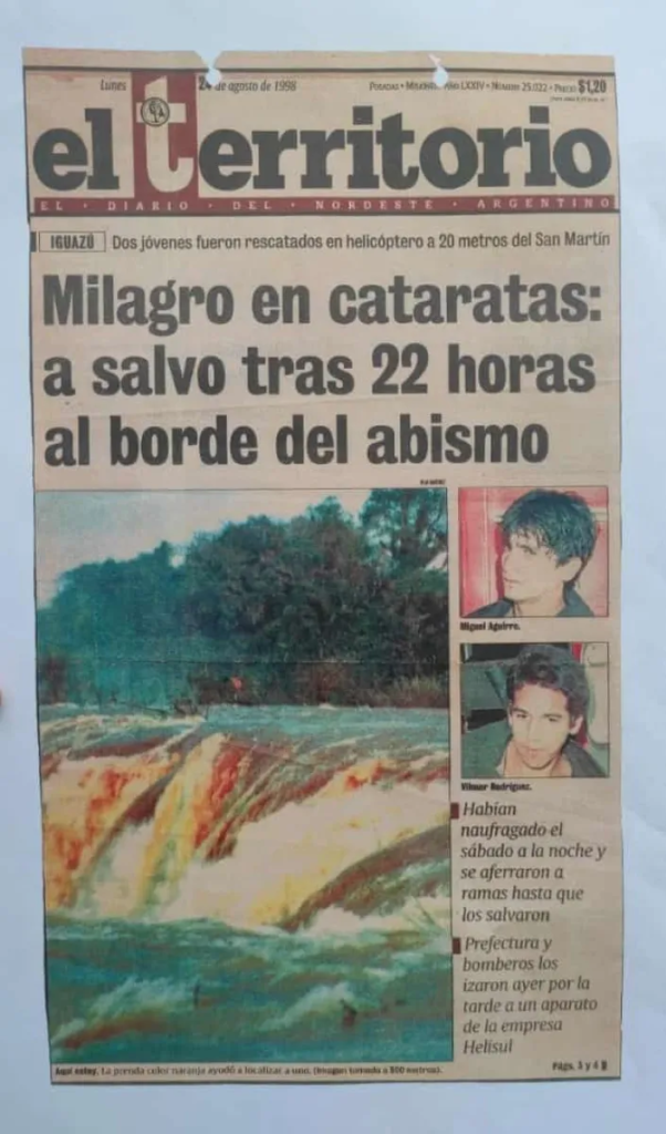 Los sobrevivientes de la increíble odisea son Miguel Aguirre, que en ese momento tenía 25 años, y Wilmar Rodríguez, de 20, ambos eran empleados de una firma concesionaria de servicios del Parque Nacional Iguazú. El hecho ocurrió cuando los dos hombres se aprestaban a trasladar una canoa con motor fuera de borda debido a que el río registraba una brusca creciente como consecuencia de las intensas lluvias. La embarcación que los transportaba quedó a la deriva cuando el motor dejó de funcionar y fue arrastrada por la correntada.