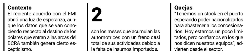 Las automotrices acumulan prácticamente dos meses de freno total al ingreso de modelos importados y, en simultáneo, padecen las limitaciones existentes para el arribo al país de piezas y accesorios provenientes de Brasil.