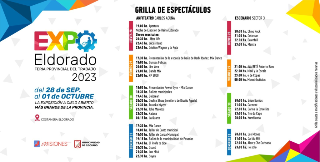 La ciudad se está preparando para una nueva edición de la Expo Eldorado 2023, la feria a cielo abierto más grande de la provincia de Misiones.Además de contar con más de 400 expositores, esta feria también ofrecerá una emocionante programación de artistas que se presentarán en dos escenarios: el Anfiteatro Carlos Acuña y un escenario alternativo.