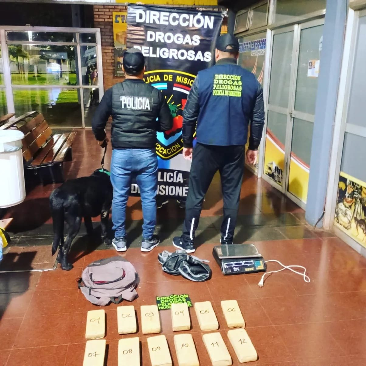 El perro antinarcóticos “Rojo” de la Dirección de Drogas Peligrosas detectó a 15 paquetes de marihuana durante el control de bolsos de los pasajeros en la Terminal de Ómnibus sobre la avenida Santa Catalina. La droga estaba distribuida en dos mochilas abandonadas en los andenes del lugar.
