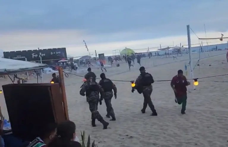 Esto es en la zona donde se ubica el Fan Zone dispuesto por la Conmebolen el reconocido balneario carioca. Ante el cruce de hinchadas, las fuerzas de seguridad locales se acercaron, lanzaron gas lacrimógeno y bombas de estruendo y dispararon balas de goma. La respuesta de los argentinos no fue correr, fue comenzar a arrojar botellas, reposeras y otros objetos contundentes a la policía militar, que los empujó hacia el mar y luego detuvo a algunos de los protagonistas, incluyendo algunos que habían escapado al agua.
