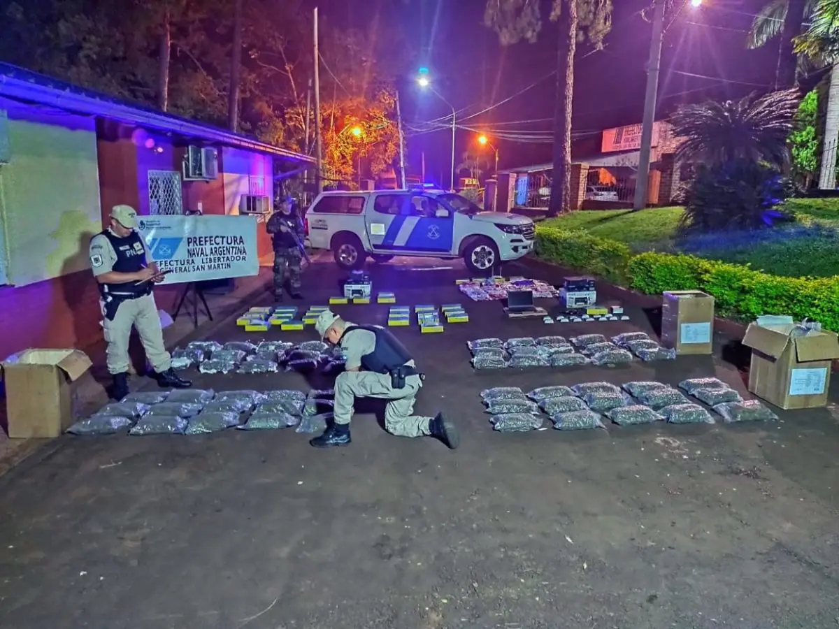 La Prefectura Naval Argentina detuvo a un traficante de drogas, incautó más de 61 kilos de marihuana y un cargamento de mercadería de contrabando, en un procedimiento realizado en Puerto Rico, Misiones, en el marco de los constantes patrullajes que se realizan en la zona de frontera para prevenir el delito.