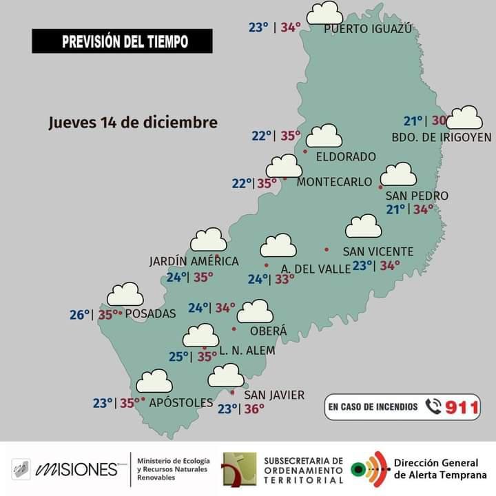 Precipitaciones: no se esperan. Probabilidad de precipitación: 5/30 %. Probabilidad de nieblas y neblinas: alta.Vientos: del noreste y norte. Velocidades entre 6 y 17 km/h. Probabilidad de ráfagas de entre 20 y 50 km/h. Calidad del aire: buena.Temperaturas: máxima en la provincia estimada en 36 °C para San Javier con 42 °C de sensación térmica; la mínima sería de 21 °C en Bernardo de Irigoyen.Viernes 15 de diciembreOla de calor en Misiones. Los vientos del norte y noreste continúan conformando una amplia masa de aire caluroso y húmedo, con temperaturas mínimas entre 23 y 27°C y máximas para este viernes entre 33 y 38 °C, comenzando así una ola de calor que se prolongará hasta el domingo. Precipitaciones: no se esperan. Probabilidad de precipitación: 0/20 %. Probabilidad de nieblas y neblinas: baja.Vientos: predominantes del norte y noreste. Velocidades entre 4 y 16 km/h. Probabilidad de ráfagas de entre 20 y 50 km/h. Calidad del aire: buena.Temperaturas: máxima en la provincia estimada en 38 °C para Eldorado con 43 °C de sensación térmica; la mínima sería de 23 °C en Bernardo de Irigoyen.Sábado 16 de diciembre Poco cambio en las condiciones del tiempo en el inicio del fin de semana, continúa seco, con vientos del norte, intensificándose el calor por la tarde. Sol y cielo parcialmente nublado durante la jornada. Precipitaciones: no se esperan. Probabilidad de precipitación: 0/20 %. Probabilidad de nieblas y neblinas: baja.Vientos: predominantes del norte y noreste. Velocidades entre 5 y 21 km/h. Probabilidad de ráfagas de entre 20 y 40 km/h. Calidad del aire: buena.Temperaturas: máxima en la provincia estimada en 39 °C para Montecarlo con 43 °C de sensación térmica; la mínima sería de 23 °C en San Pedro.FUENTE: Dirección General de Alerta Temprana – Subsecretaría de Ordenamiento Territorial – Ministerio de Ecología y RNR de la Provincia de Misiones.