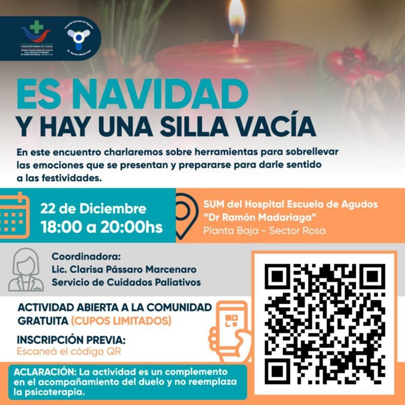 El viernes 22 de diciembre se realizará el taller “Es Navidad y hay una silla vacía”, coordinado por la Lic. Clarisa Pássaro Marcenaro, integrante del Servicio de Cuidados Paliativos.