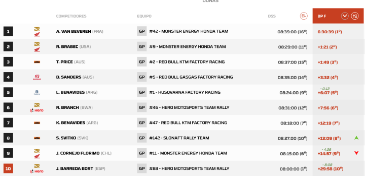 En Motos, los hermanos Benavides vienen perdieron terreno, sobre todo después de la rotura de motor y penalización de Luciano, que hoy llegó en el 5to lugar. Su hermano Kevin se ubicó en la 7ma posición y sigue cayendo en la general. Van Beveren fue el más rápido de este jueves y Brabec lidera la general.