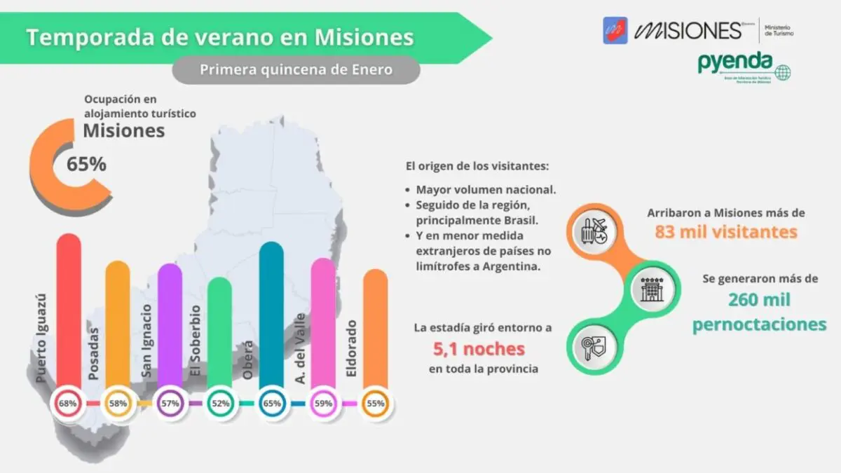 Según datos relevados por el Ministerio de Turismo, en la primera quincena de enero, se registró en la provincia una ocupación de alojamiento promedio entorno al 65%; con Puerto Iguazú alrededor de un 70%; y Posadas, un 60%.