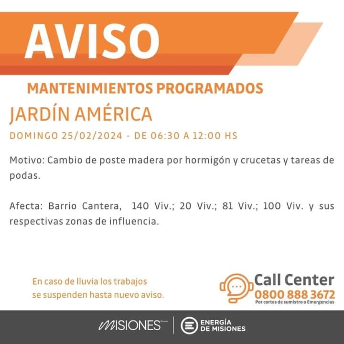 En Jardín América las tareas se llevarán adelante el domingo 25 de 6.30 a 12hs. El corte de energía está programado para los barrios Cantera, 140 Viviendas, 81 Viviendas, 100 Viviendas y sus respectivas zonas de influencia. En la ocasión, se realizará cambio de postes de madera por hormigón y crucetas, y tareas de poda.