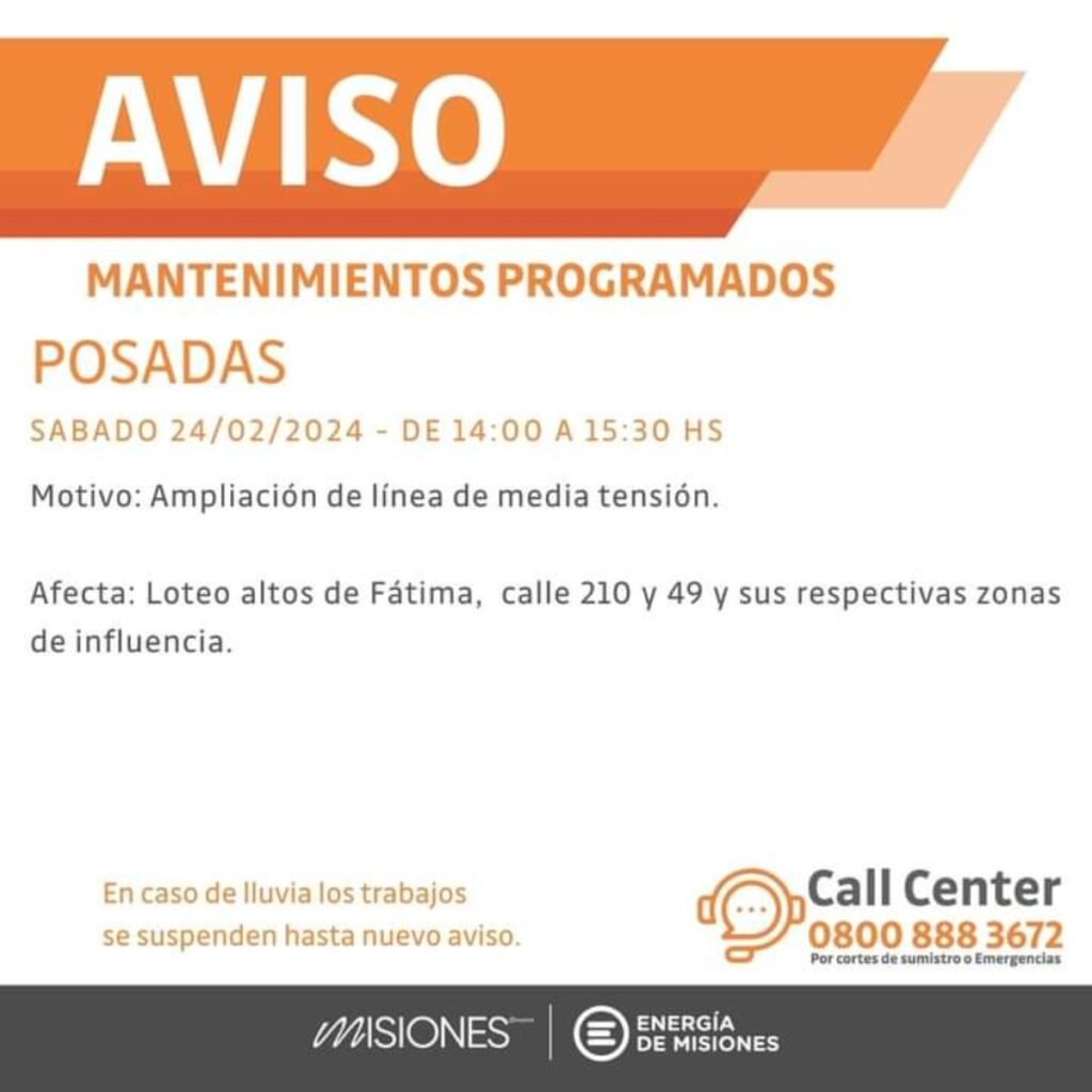 En el caso de Posadas, este sábado 24 el servicio estará interrumpido de 14 a 15hs, ya que durante ese tiempo se llevará adelante la ampliación de la línea de media tensión. La zona que permanecerá sin energía en dicho horario será el loteo altos de Fátima, calle 210 y 49, y sus respectivas zonas de influencia.