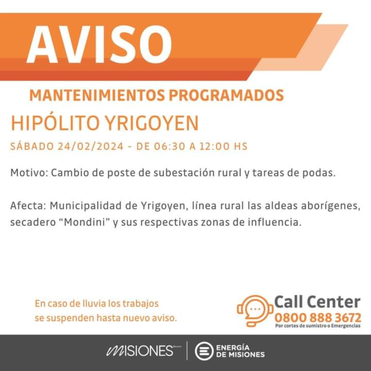 Mientras que en la localidad de Hipólito Yrigoyen, este sábado 24, Energía de Misiones hará cambio de postes de subestación rural y tareas de podas. El servicio estará interrumpido de 6.30 a 12hs y afectará a la Municipalidad de Yrigoyen, línea rural de las comunidades originarias, secadero Mondini y sus respectivas zonas de influencia.